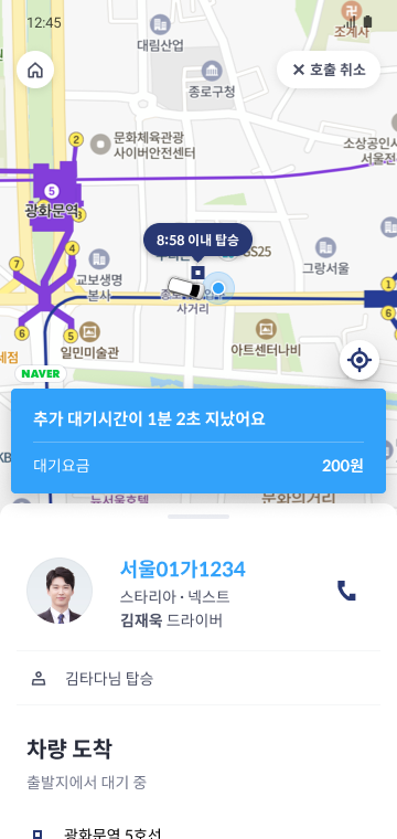 - After 5 minutes of free waiting time, an additional charge of 200 won per minute is added.