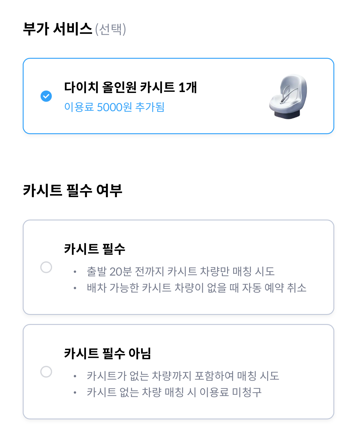 일부 타다 차량에는 카시트가 설치되어 있으며, 예약 신청 시 카시트 부가서비스를 이용하실 수 있습니다.
