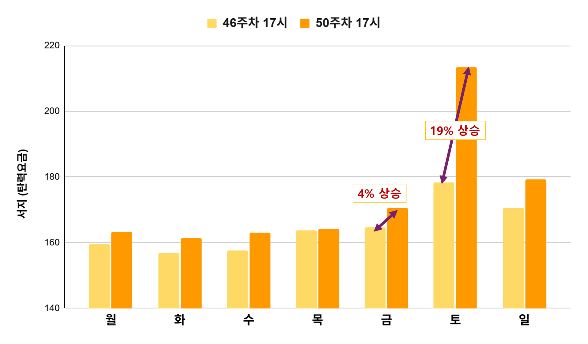 수요가 집중됨에 따라, 해당 요일에는 전반적으로 높은 탄력요금이 적용되고 있습니다.