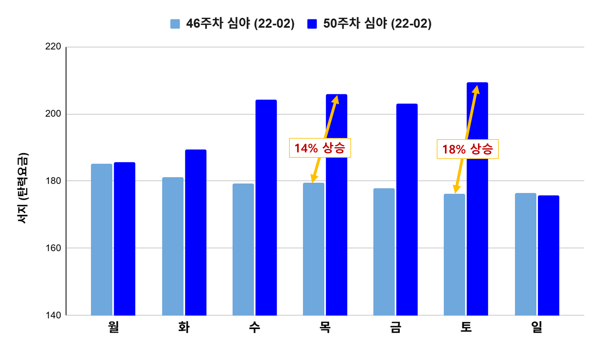 특히 심야 시간대(밤 10시 ~ 새벽 2시)에는 평소 대비 탄력요금이 약 30%가량 더 높게 나타나고 있습니다.